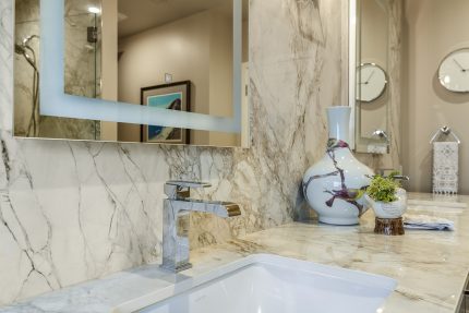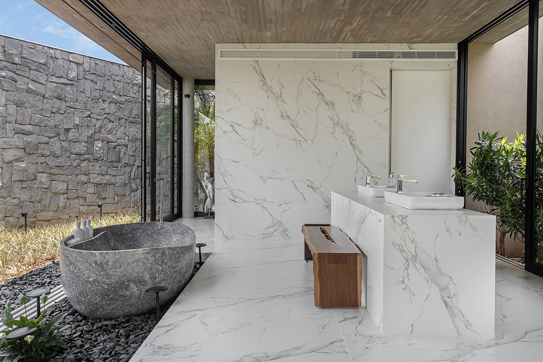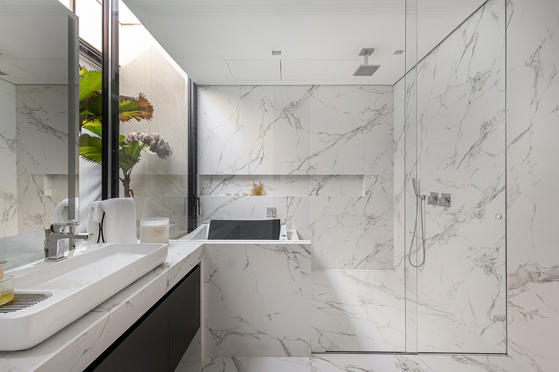 Haciendo honor a los mármoles Calacatta y Carrara, la personalidad de Aura habla por sí sola. Sobre su fondo blanco se dibujan las vetas que evocan las líneas de estas piedras naturales.
